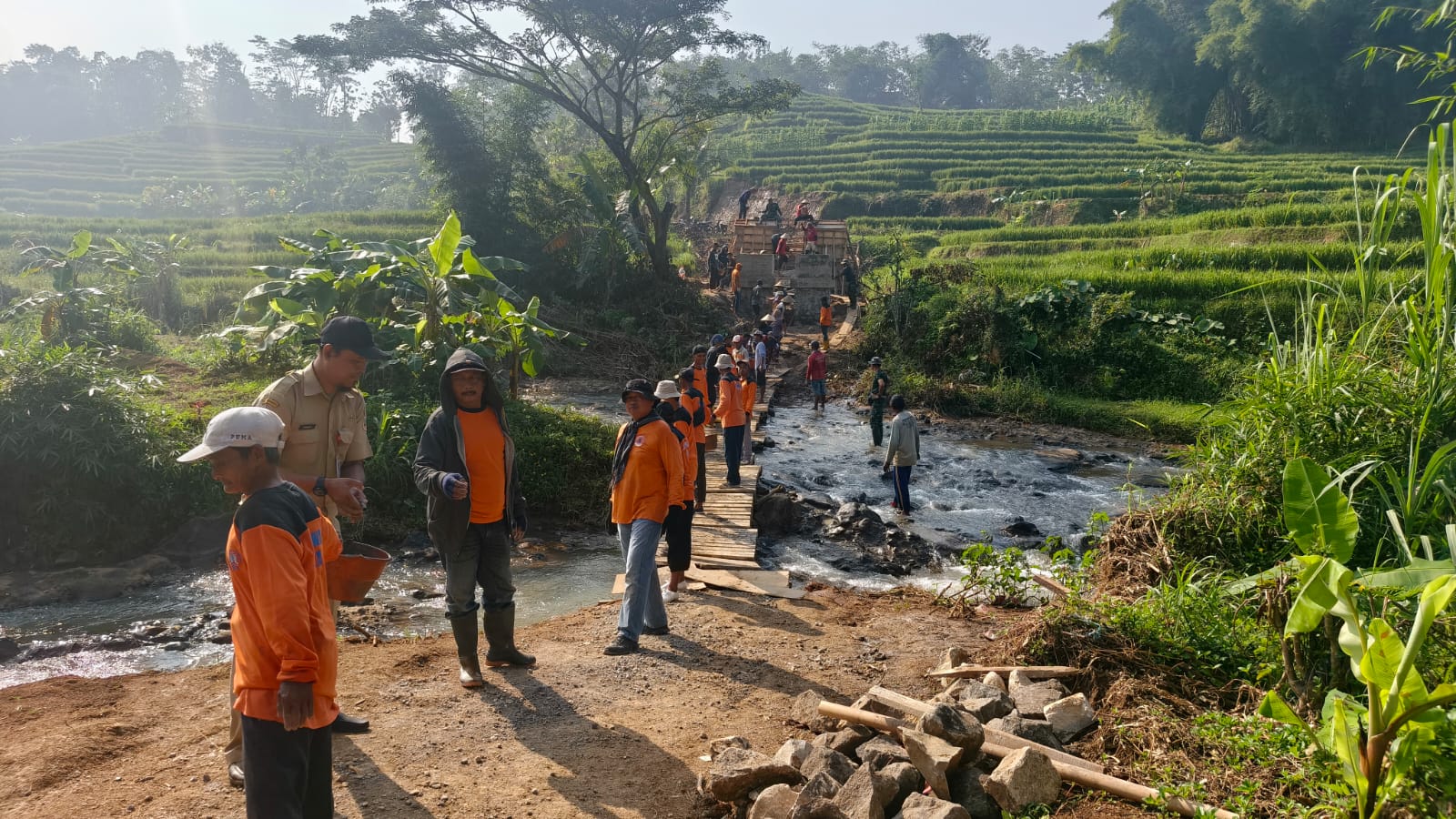 Sejak pagi hari, puluhan personel tampak berjibaku di lokasi pembangunan. Anggota Koramil 18 Girimarto turun langsung ke lapangan bersama berbagai elemen masyarakat dan organisasi kemasyarakatan. Kali ini, Ormas MTA turut mengirimkan banyak relawan untuk membantu pengerjaan, mulai dari mengangkut material hingga mendukung proses pengecoran secara bergotong royong.