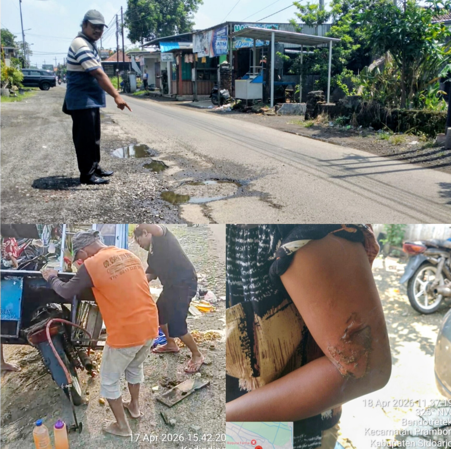 IniSIDOARJO //tower.i-news.site. Kecelakaan akibat infrastruktur jalan yang buruk kembali terjadi. Kali ini, sebuah insiden menimpa seorang pedagang mie ayam bakso keliling di Jalan Kedinding RT 01, Kecamatan Tarik, Kabupaten Sidoarjo, pada Jumat (17/4/2026). Korban mengalami luka bakar serius setelah gerobak motornya terguling akibat menghindari jalan berlubang.